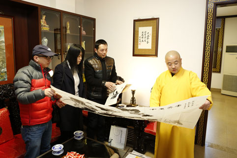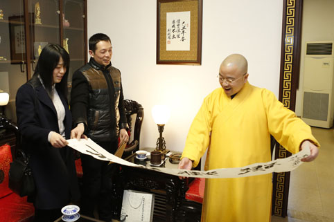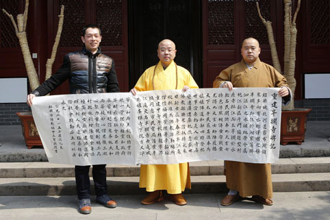 暖风和煦,春意盎然。2016年3月1日,绍兴青年书法家贺飞跃先生率同我市书法界有关人士专抵炉峰禅寺,将他凝心恭书的《重建半搁寺碑记》送赠炉峰禅寺,以表达他对“佛、法、僧”三宝的敬重之情。