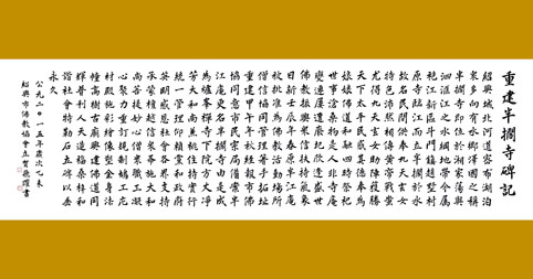 仰赖党和政府英明,感恩社会各界支持,承蒙檀越信众布施,大和尚菩提妙心,僧众职工凝心聚力,重订规制,鸠工庀材,殿施彩绘,像塑金身,法幢高树,古庙兴建,佛道同辉,普利人天,造福桑梓,和谐社会。特勒石立碑,以垂永久。