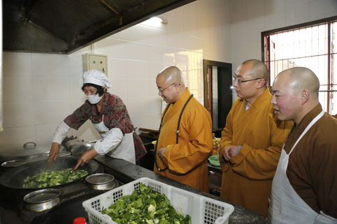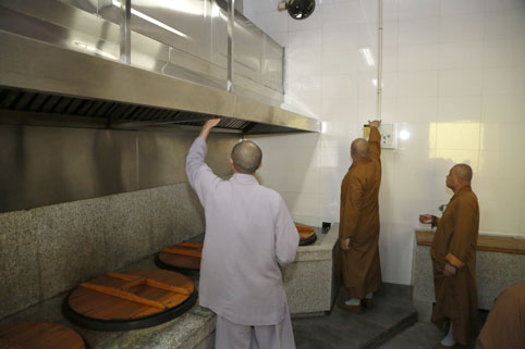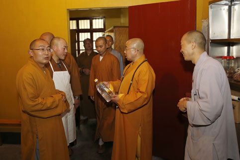 大和尚一行还先后来到菩提斋和大小厨房、储物间等,进行实地检查和现场指导。看到正在忙忙碌碌的僧众职工,大和尚亲切地一一招呼,叮嘱他们当心油溅火烫、地湿滑倒,注意人身安全。对厨房工作,大和尚要求做到“地面无污垢、梁上无灰尘、油烟常清洗、煤气随手关”,操作人员更要注重个人卫生,同时防火防电,加强日常安全。