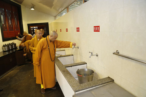 2016年4月27日上午,大和尚一行首先来到五观堂,看到地面一尘不染,桌椅摆放有序,大和尚高兴地说,佛家提倡“食存五观”,五观堂不但是僧众应供的地方,也是修行的场所,唯有整洁,方能显示庄严。