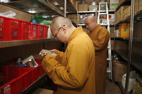 在储物间,看到摆放的五大缸咸菜和几大包笋干菜,大和尚感慨地说,绍兴人说“日子常淡淡,咸菜长嗄饭”,这就是修行。现在寺院条件好了,也要注意节俭,这是我们的家风。大和尚还不时讯问米、油、盐和干货等储备情况,当他看到柜子里安放的福田油(点灯用的香酥油)时,再三吩咐,千万不要将酥油与食品油混放在一起,要落实责任,专人保管,防止错拿误用。对一些陈旧的家俱,有人提出换掉时,大和尚风趣地说,用了这么多日子,感情已很深了,修一下能用的还是用起来,看着怀旧。