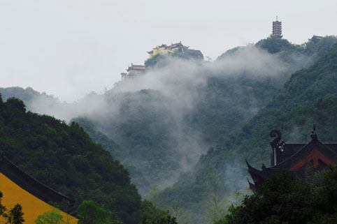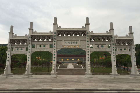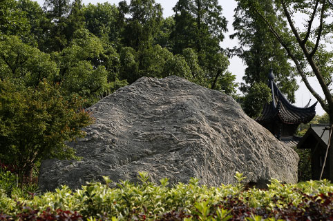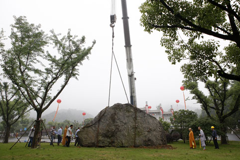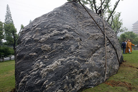 正是江南特有的梅雨时节,会稽山脉烟雨笼罩,越中佛国梵音缭绕。最近到炉峰禅寺礼佛敬香、登山游览的人们,不经意间惊喜地发现,普门法界(寺前广场)新建的五门牌坊前,突然“飞”来了一块巨大的泰山石,远眺似山水画卷,大气凝重,细察如玉石珍玩,古朴苍劲,在霖雨的滋润下,晶莹剔透,层次分明。泰山石与香炉峰巅的飞来石(福寿石)遥相呼应,与庄严雄伟的五门牌坊相得益彰,成为炉峰禅寺步移景换的又一看点。