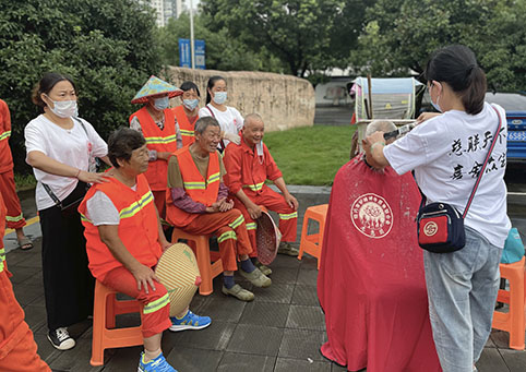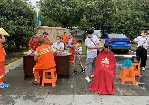 8月13日,慈联种福田志愿服务队的9位志愿者一早来到兰亭镇政府广场,开展“爱心献环卫 温暖你我他”活动,为环卫工人提供理发、保健按摩、测量血压等服务,同时送上蛋糕、清凉绿豆汤、夏令用品等。