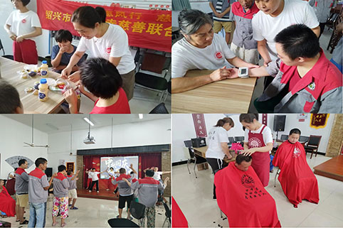 9月9日,慈联种福田志愿服务队10位志愿者走进东浦街道残疾人庇护中心,开展“关爱残疾人”活动,提供理发、量血压、肩颈按摩等志愿服务,互动表演,并送上爱心糕点。