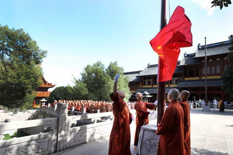 大和尚在致辞时指出,五星红旗是中华人民共和国的国旗,是伟大祖国的象征,是中华民族大团结的集中体现。红色象征着革命先烈的鲜血,每个公民和组织,都应当尊重和爱护国旗。佛教徒首先是国家的公民,爱国爱教,与党和政府同心同行,是每个正信的佛教徒必须遵循的法则。看到五星红旗高高升起、迎风飘扬,我们就会觉得无比骄傲、无比自豪,从而更加增强社会意识、国家意识和公民意识。早在2008年奥运会期间,炉峰禅寺就开始在寺院升挂国旗、教旗,同时在殿堂两侧设立宣传窗、标语牌,结合时事形势,对僧众职工进行爱国主义教育,制定和完善升挂国旗的制度,以进一步增强教职人员和广大信教群众的爱国情感和国家意识。2009年国庆前夕,我市佛教界喜庆新中国60华诞“祝福中国”祈福法会升国旗仪式在炉峰禅寺隆重举行。此后,每逢元旦新春、建党纪念日、国庆节等重大节日和宗教重要节会,炉峰禅寺都依法规范升挂国旗,举行仪式,并在大型会议和重大活动开始前奏唱国歌,自觉接受政府宗教事务部门的管理,逐渐形成常态化,在全市佛教界率先垂范,带头做好,受到社会的肯定与好评。