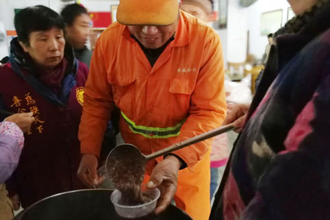 在绍兴雨花斋,义工们为环卫工人送上一碗碗冒着热气的腊八粥。“数九寒天这个季节,能吃到慈联会送来的一碗腊八粥,真幸福!”经常来雨花斋吃素的环卫工人张师傅说。