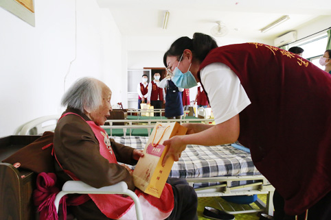 在市社会福利院过锦芳书记的陪同下,了德常务副会长、邵芷玲秘书长一行专门前往老年活动室、部分病房、住室,为行动不便的老人送上月饼。了德常务副会长代表慈联会和净芳会长,向老人们致以亲切问候,衷心祝愿他们中秋节快乐,祝福他们健康长寿,安享晚年!