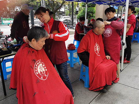 3月19日,慈联康乃馨志愿服务队志愿者冒雨来到皋埠镇上蒋市场,开展志愿服务活动,为大众提供免费理发、测量血压、血糖、检查视力、按摩等服务,帮助他人,快乐自己!
