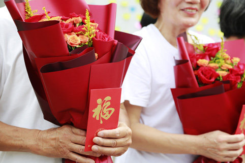 重阳节当天,净芳会长又亲赴现场慰问23位70岁以上的五星级志愿者老人,感谢他们在古稀之年,不忘服务社会,奉献自己对慈善公益事业的热忱之心,并一一为他们送上鲜花、礼品和红包,祝愿他们节日快乐,健康长寿。