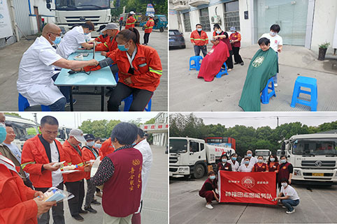 4月24日,慈联种福田志愿服务队的10位志愿者来到浙江飞龙环境有限公司(耶溪路),开展“爱心献环卫 温暖你我他”活动,为环卫工人提供理发、肩颈按摩、测量血压等服务,并送上牛奶、糕点、防疫口罩等。