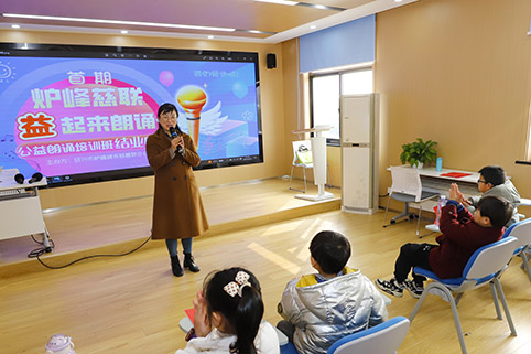 2月25日,在绍兴市社会组织党群服务中心(慈善基地)的公益教室内,炉峰禅寺慈善联合会首期公益朗诵班的学员们正在结业汇报演出,现场书声琅琅,童心灿灿,气氛活跃。