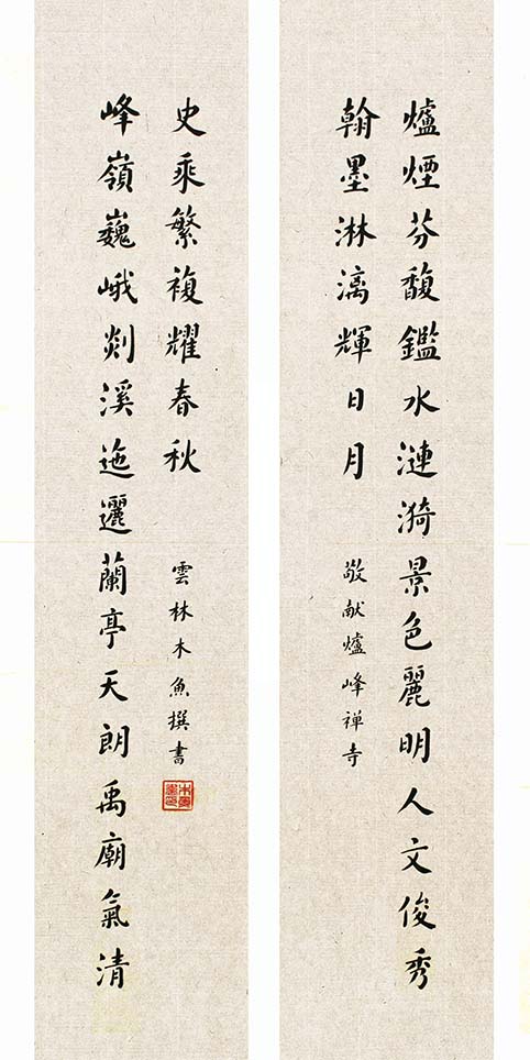 炉烟芬馥,鉴水涟漪,景色丽明,人文俊秀,翰墨淋漓辉日月 峰岭巍峨,剡溪迤逦,兰亭天朗,禹庙气清,史乘繁复耀春秋 【书法作者】木鱼长老,曾任杭州灵隐寺、温州江心寺方丈,中国佛教协会咨议委员会委员、浙江省佛教协会名誉会长,著有《沧海吟馀》《沧海吟馀续编》《孤屿明灯录》等。