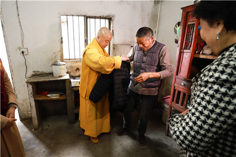 蔡家江村的王妙祥,今年65岁,视力重度残疾一级,身体患有重症,无经济收入,独居。当王妙祥穿上羽绒服时,兴奋地说:“大小刚刚好,今年冬天不会冷了。”