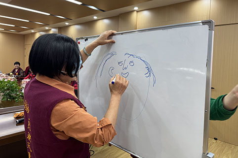 大家参加“蒙眼画画”PK游戏,展示国标双人舞、双人健身球、葫芦丝独奏等文艺才能,现场充满欢歌笑语。