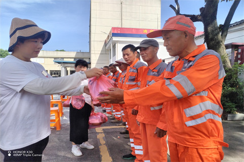 志愿者为华舍街道的40位环卫工人每人送上一份清凉用品。