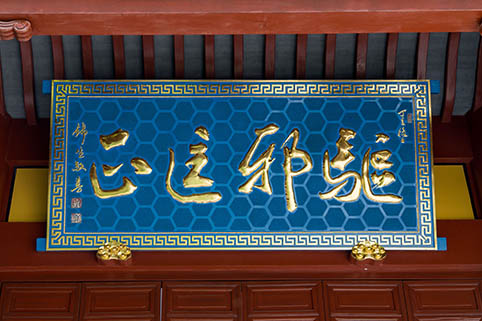 “驱邪匡正”匾额由著名工艺美术师、职业画家谢锦生手书。