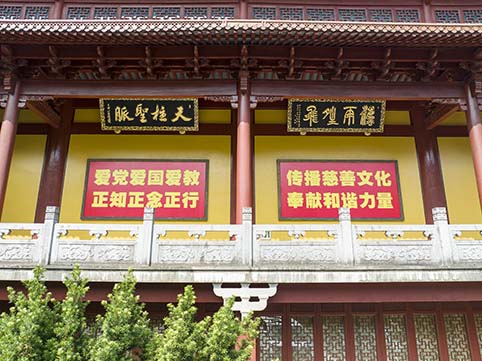 天王殿外面东西两侧,分别悬挂“法雨晴飞”“天柱圣脉”和“青连秦望”“环山蓄翠”匾额。 按:“法雨晴飞”出自孟浩然诗词“法雨晴飞去,天花昼下来”,谓佛法如雨露普化万物。“天柱”指代炉峰禅寺,寺院古称天柱精舍、天柱山寺。